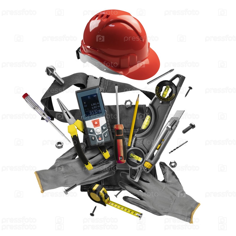 Строительные инструменты левитируют на белом фоне