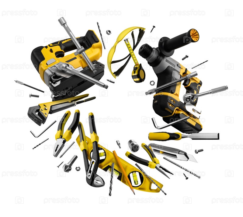 Строительные инструменты левитируют на белом фоне