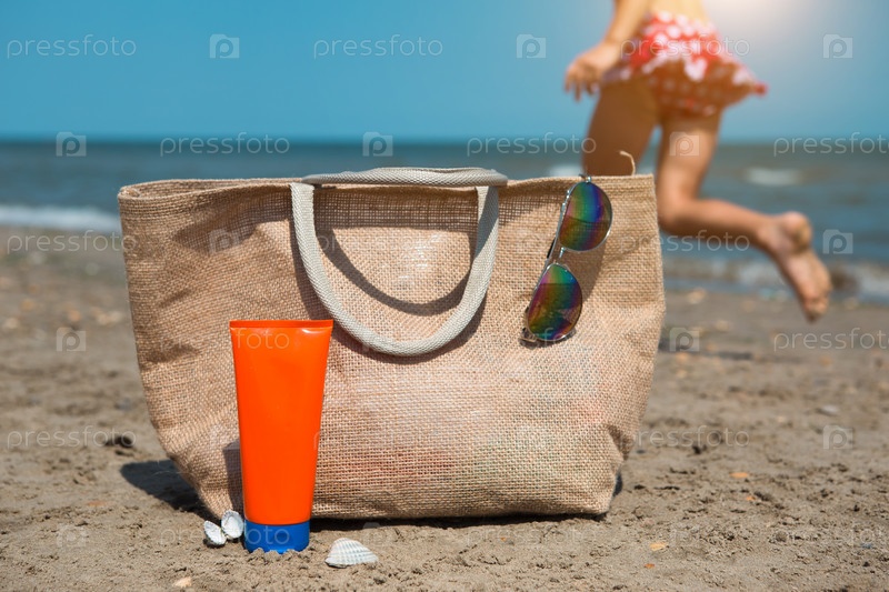 Оранжевый тюбик с солнцезащитным кремом, солнцезащитными очками и пляжной сумкой стоит на песке у моря и качается на ветру. Защита от ультрафиолета, пляжный отдых, путешествия