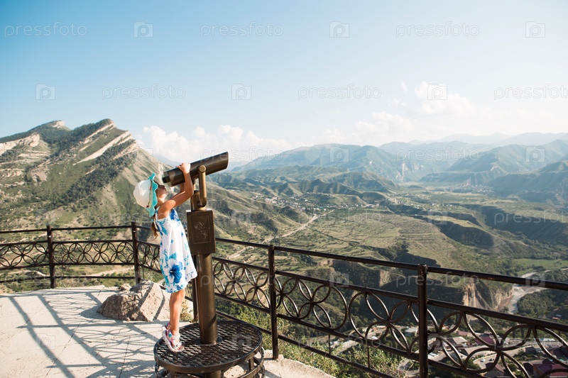 Туристка смотрит в бинокль с высоты на смотровой площадке на горный пейзаж. Тур по достопримечательностям. Дагестан, Кавказские горы