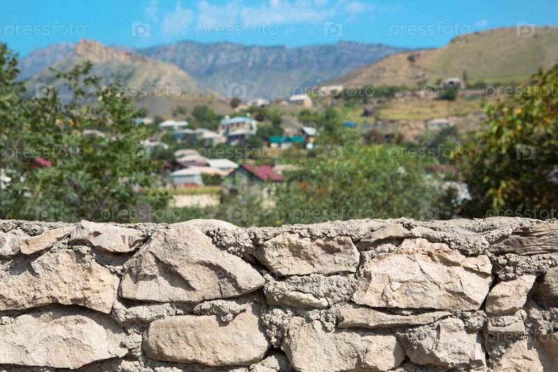 Кирпичные каменные стены естественного переднего плана на фоне горной деревни с домами и деревьями в расфокусированном виде.. Туризм, экология, экологически чистая тема