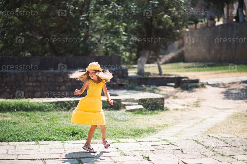 Туристка в желтой шляпе и сарафане танцует по улице старого города из камня с крепостью. Тур по достопримечательностям