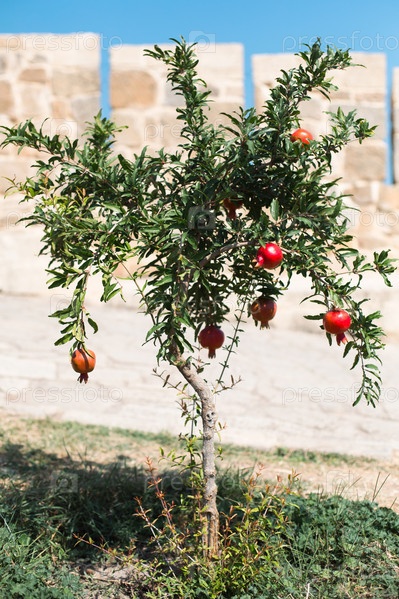 Спелый красный гранат висит на ветке фруктового дерева. Натуральная еда, экологически чистый, фруктовый сад