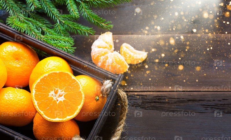 Свежие мандарины в коричневой коробке на деревянном фоне с зелеными еловыми ветками. Рамка, пространство для копирования, праздничный и зимний аромат, новый год, Рождество. Здоровое питание, апельсиновый сок, витрина. Нарезать и вырезать