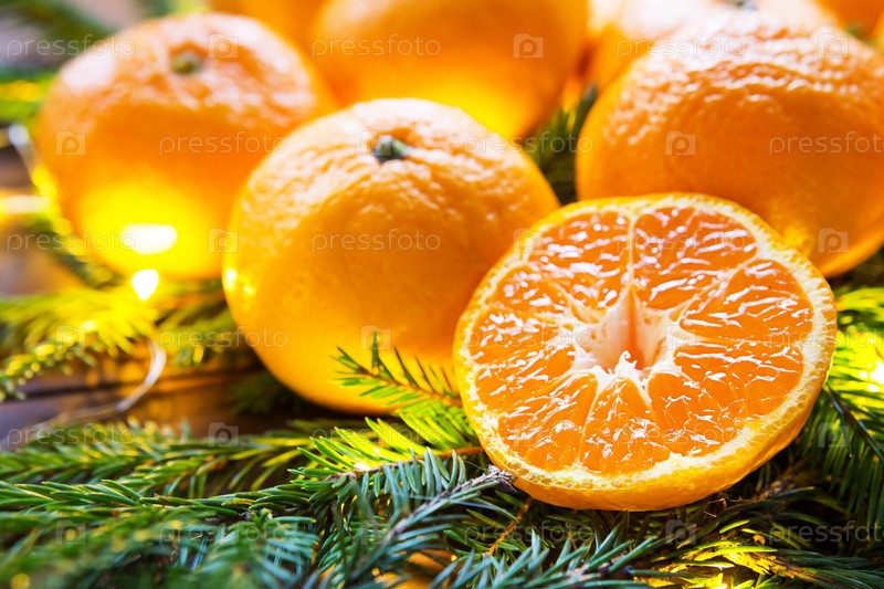 Свежие мандарины в гирляндах, на еловых ветках и мишуре - яркий новогодний фон. Половинка апельсина, цитрусовый аромат праздника. Рождество, Новый год. Место для текста