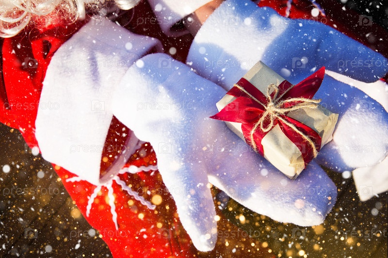 Коробка с рождественским подарком в руках Деда Мороза в белых варежках. Красный костюм, борода, гирлянды в размытом свете. Новый год, подготовка, ожидание чуда, сбывшаяся мечта. Крупным планом