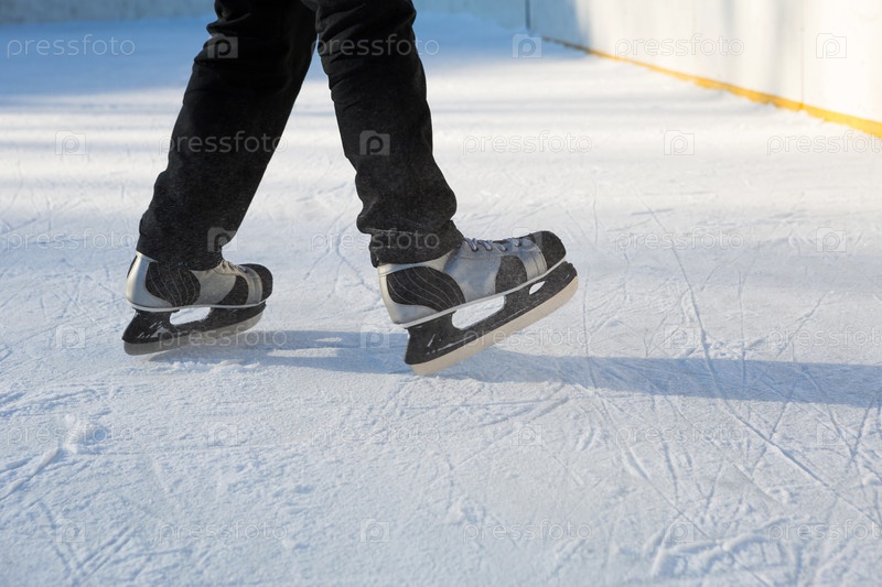 Взрослые мужские коньки крупным планом на льду зимой на открытом воздухе в движении. Катание и скольжение в морозный солнечный день, активный зимний спорт и образ жизни