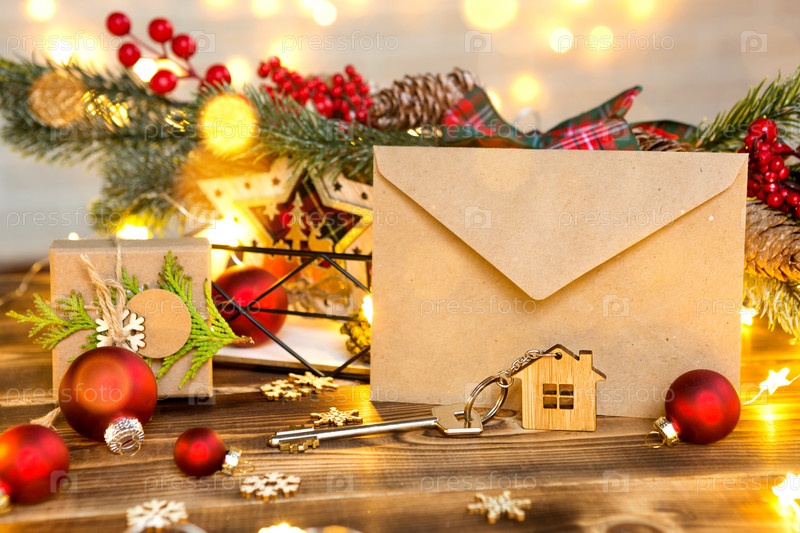 Ключ от дома с брелоком на столе с рождественским декором. Подарок на Новый год, Рождество. Строительство, дизайн, проект, переезд в новый дом, ипотека, аренда и покупка недвижимости. Копировать пространство