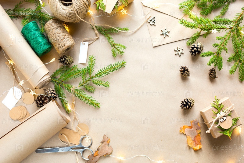 Фон с копирайтом на Рождество и новый год из экологически чистых материалов: крафт-бумага, подарочная коробка, живые еловые ветки, шишки, шпагат. Теги с макетом, натуральный декор, ручная работа, сделай сам. категорически