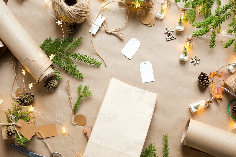 Подарочная упаковка к Рождеству и Новому году из экологически чистых материалов: крафт-бумага, живые еловые ветки, шишки, шпагат. Теги с макетом, натуральный декор, ручная работа, сделай сам. Скопируйте пространство. Плоско, фон