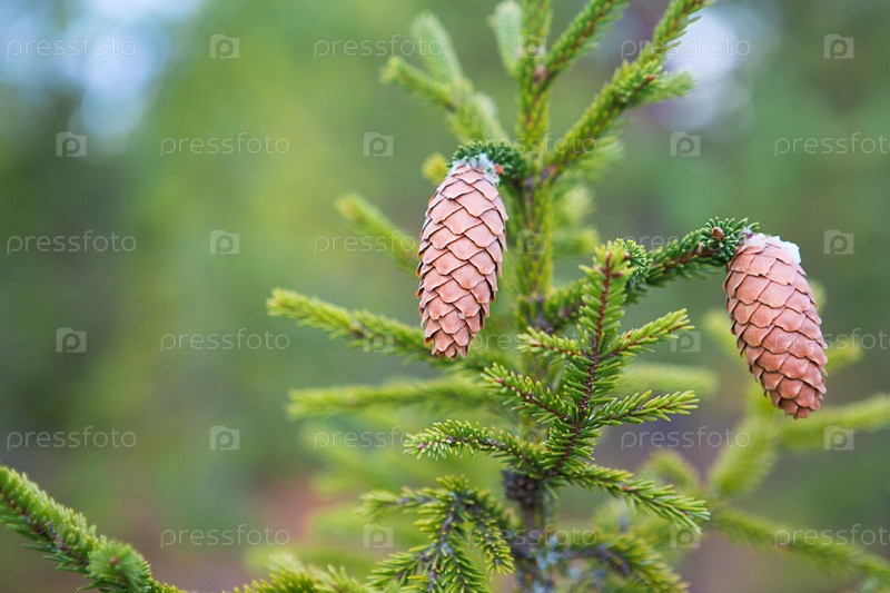 Сосновая шишка на ели крупным планом на естественном зеленом фоне. Елка, вечнозеленое хвойное, сосновые шишки со смолой. Новый год. Рождественская ярмарка. Место для текста