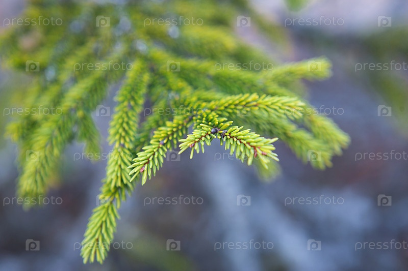 Еловая ветка с короткими иголками крупным планом. Естественный фон, текстура зеленой елки, узор. Рождество, новый год. Место для текста. Выборочный фокус