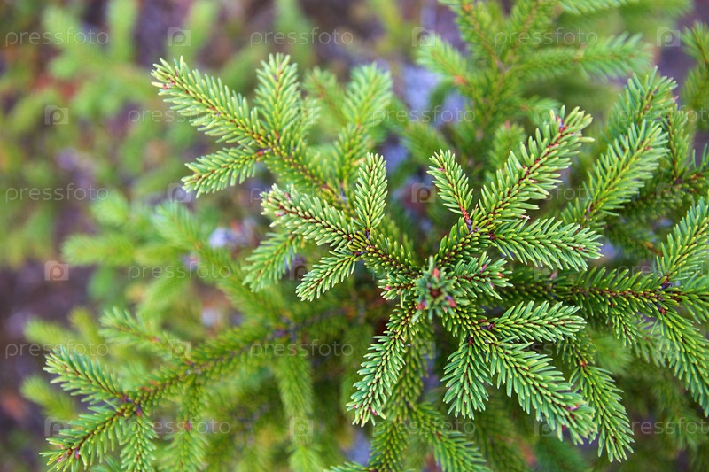 Еловая ветка с короткими иголками крупным планом. Естественный фон, текстура зеленой елки, узор. Рождество, новый год. Место для текста. Выборочный фокус