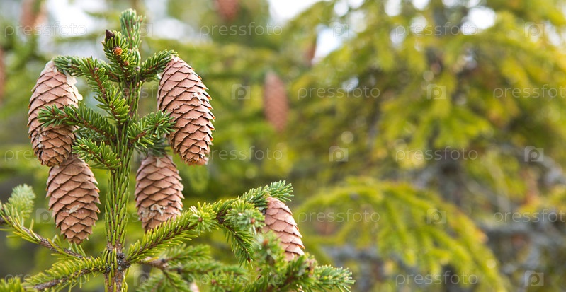 Сосновая шишка на ели крупным планом на естественном зеленом фоне. Елка, вечнозеленое хвойное, сосновые шишки со смолой. Новый год. Рождественская ярмарка. Место для текста