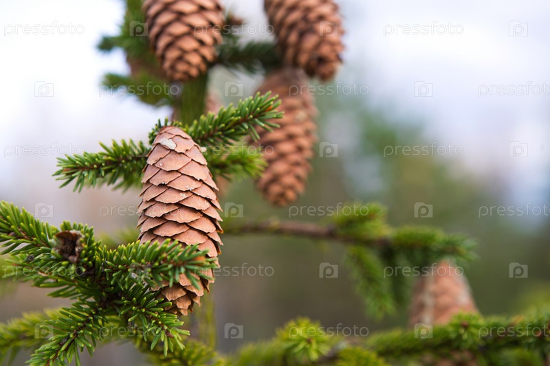 Сосновая шишка на ели крупным планом на естественном зеленом фоне. Елка, вечнозеленое хвойное, сосновые шишки со смолой. Новый год. Рождественская ярмарка. Место для текста