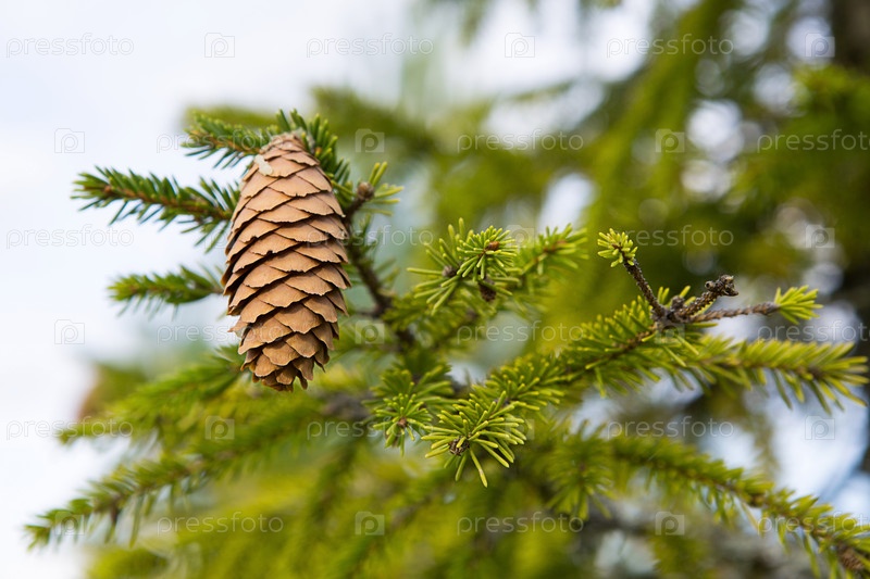 Сосновая шишка на ели крупным планом на естественном зеленом фоне. Елка, вечнозеленое хвойное, сосновые шишки со смолой. Новый год. Рождественская ярмарка. Место для текста