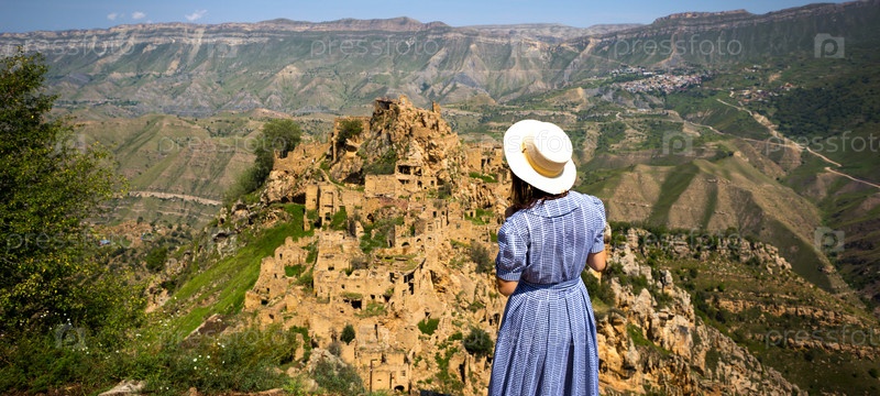Туристка высоко в горах Дагестана любуется захватывающим панорамным видом на природу и древний заброшенный город Гамсутль. Кавказские горы, туристическая достопримечательность, руины, поход
