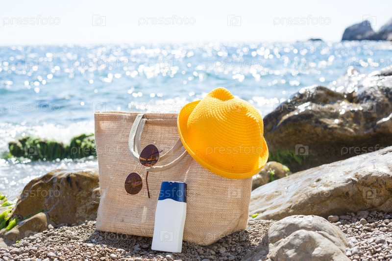 Пляжная сумка с белым тюбиком солнцезащитного крема на галечном пляже у моря. Путешествия, пляжный отдых на курорте, очки, желтая шляпа. Защита кожи от УФ-лучей, масло для загара. Скопируйте пространство, макет