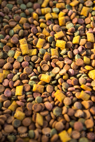 Сухой корм для кошек и собак крупным планом на фоне круглых гранул и подушечек с мягкой начинкой-паштетом Здоровая еда для домашних животных, copyspace