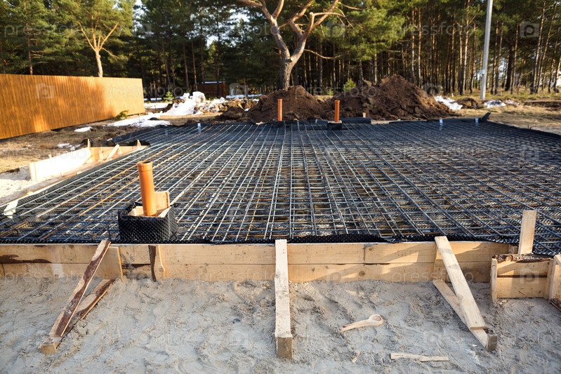 Железная арматура на деревянной опалубке с уложенными трубами является основой для заливки фундамента дома бетонной плитой. Строительство коттеджей, проектирование, инженерные коммуникации