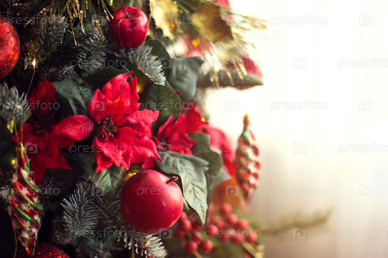 Красный декор на елку из яблок и пуансеттии. Новогодний фон и рамка на новый год. Крупный план, праздничная елка с ягодами, сосульками, гирляндами. Место для текста
