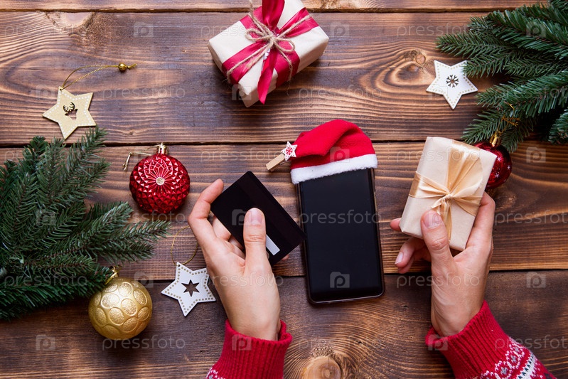 Женские руки со смартфоном в шляпе Санты, банковская карта на фоне рождественских украшений, подарочные коробки, гирлянды. Новогодний шоппинг, покупка подарков через приложение, интернет-магазин. Онлайн покупки