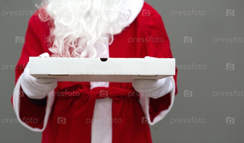 Белая коробка из-под пиццы в руках у Деда Мороза в белых варежках, с бородой, в красном пальто. Рождественская доставка фаст-фуда. Предновогодняя акция. Работа по организации питания в праздничные дни. Скопируйте пространство, макет