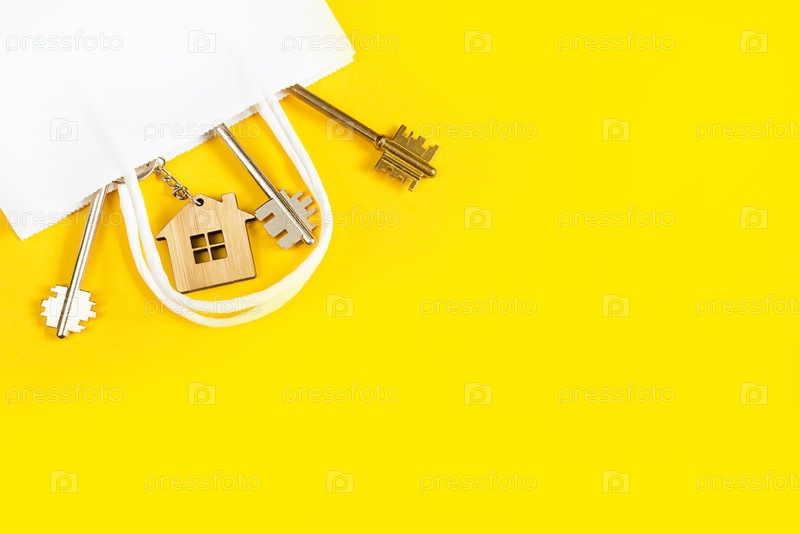 Брелок для ключей в форме деревянного дома с ключом на желтом фоне в подарочной упаковке из белой бумаги. Ипотека, аренда и покупка недвижимости, выгодное предложение под строительство. Копировать пространство