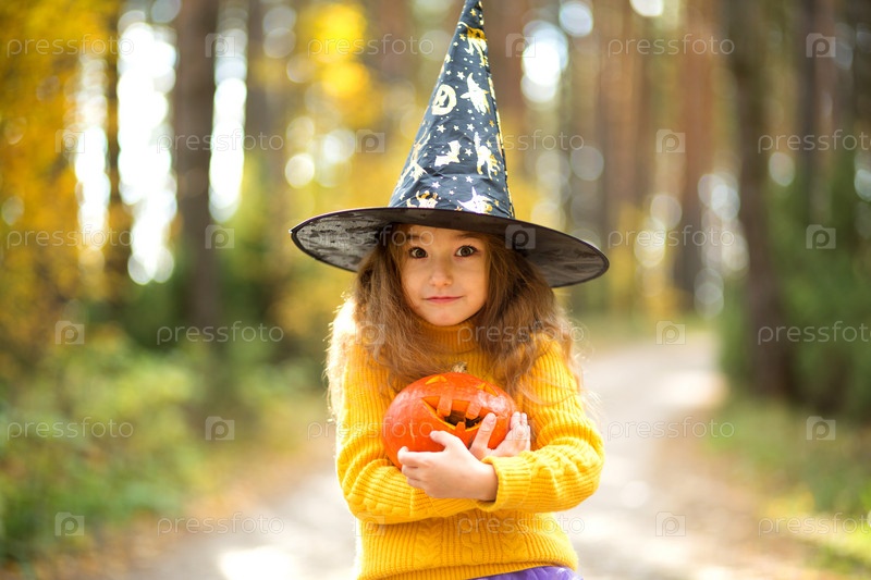 Девушка в шапке ведьмы, в желтом свитере и с тыквой с вырезанными глазами и ртом Джек-фонарь в желтом осеннем лесу. Праздник Хэллоуина