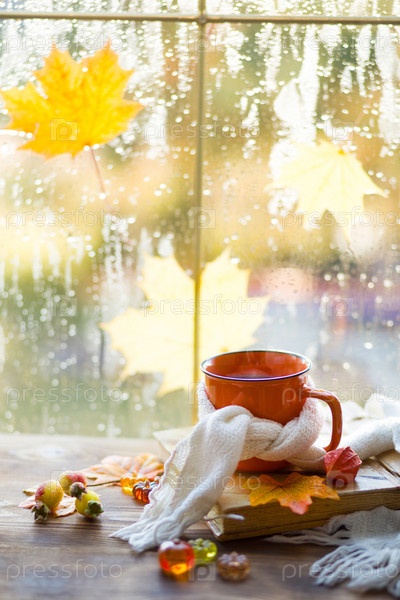 Оранжевая кружка в шарфе с горячим чаем, тыквы, желтые сухие кленовые листья, книга на подоконнике, капли дождя на окне - осеннее настроение