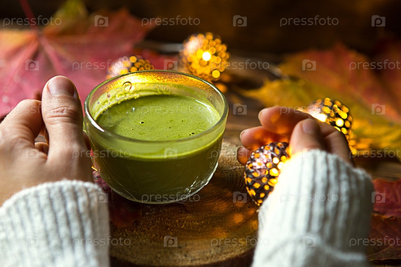 Зеленый японский чай маття с пеной в прозрачной чашке на деревянном столе в осеннем натюрморте. Женская рука с длинными рукавами белого свитера согрета напитком. Сосредоточьтесь на чашке. Теплая атмосфера и уют