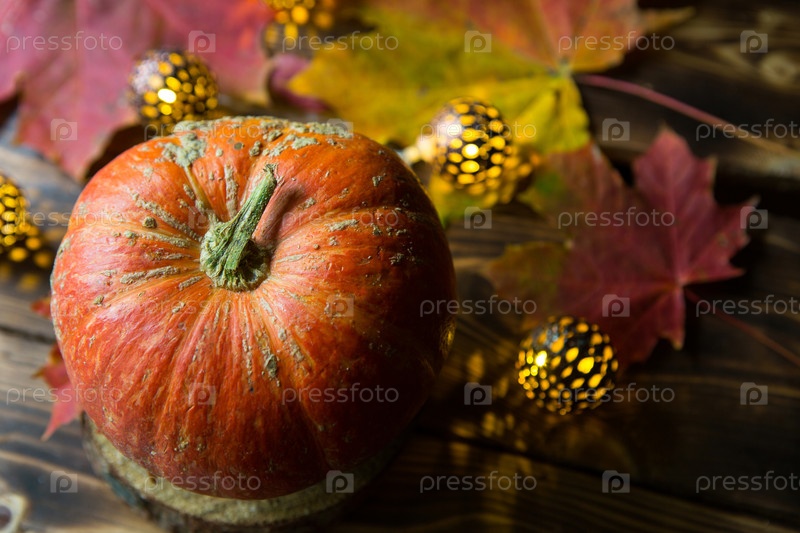 Оранжевая натуральная круглая тыква на деревянном столе с опавшими желтыми и красными кленовыми листьями, палочками корицы. Гирлянды огней, теплая осенняя атмосфера, День благодарения, праздник урожая, Хэллоуин. Копировать пространство