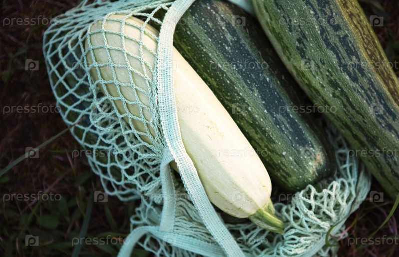 Цуккини в сетчатом мешке на траве из сада. Экологически чистый фермерский урожай