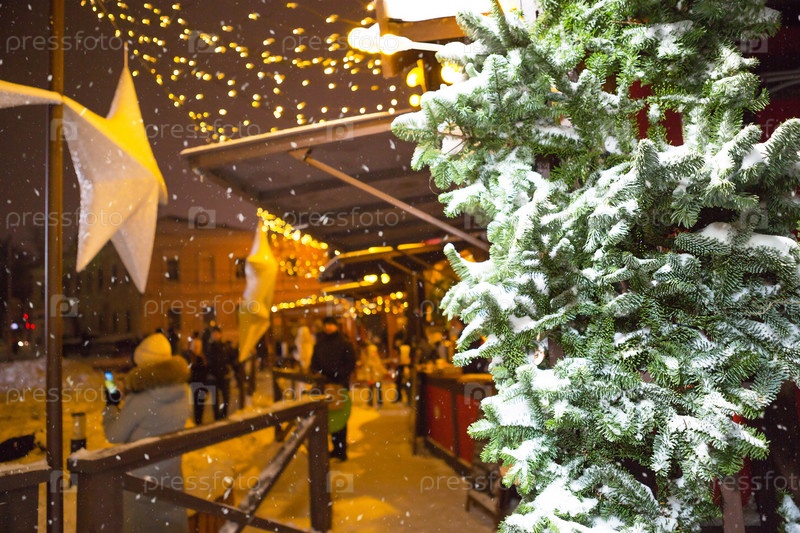 Люди ходят по рождественской ярмарке в праздничном убранстве улиц. Выставочные и торговые центры в центре города. Новый год. Калуга, Россия, декабрь 2020 г., ред