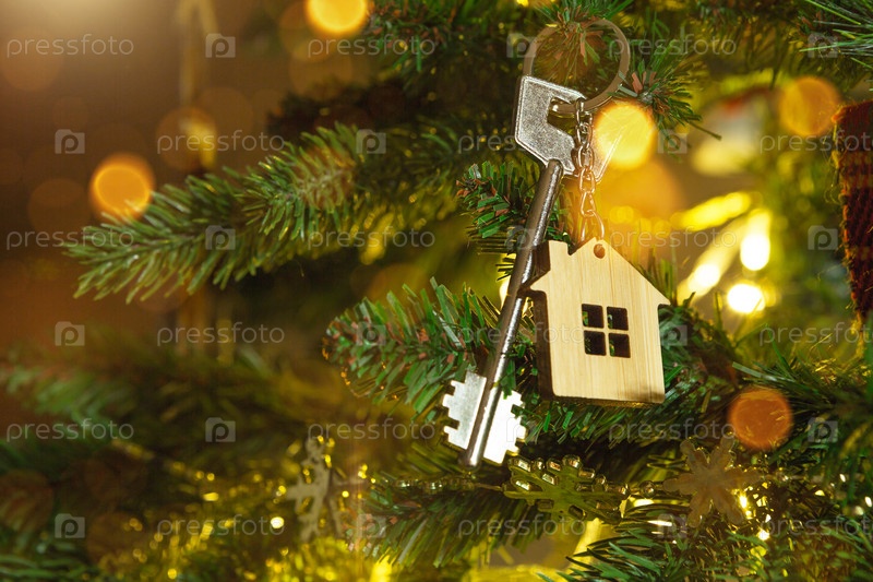 Ключ от дома с брелоком висит на елке. Подарок на Новый год, Рождество. Строительство, дизайн, проект, переезд в новый дом, ипотека, аренда и покупка недвижимости. Копировать пространство