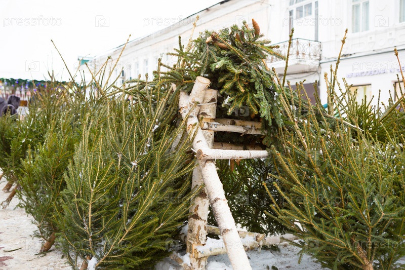 Рождественский базар с живыми елками на улице города. Новогоднее настроение, снег, продаются срезанные ели и хвоя, аромат смолы и хвои. Рождество, Новый год