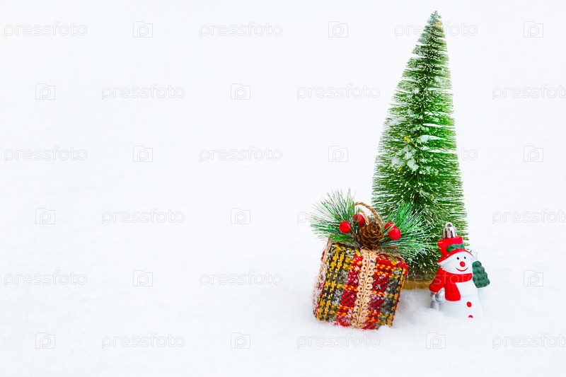 Рождественская елка, подарочная коробка и игрушечный снеговик на белом натуральном снегу во время снегопада. Украшение на Новый год и Рождество, открытка с копирайтом
