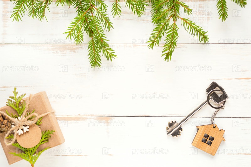 Ключ от дома на естественном фоне с коробкой с подарком на рождество и новый год. Эко-жилье, ипотека, кредит, бронирование, покупка недвижимости, заселение в свой дом