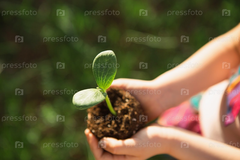 Молодой зеленый росток в руках ребенка в свете солнца на фоне зеленой травы. Натуральные саженцы, экологичность, новая жизнь, молодость. Концепция развития, мира, заботы. Копировать пространство