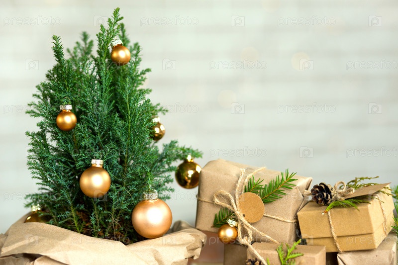 Комнатный кипарис в горшке украшен шарами наподобие елки с гирляндами. Подарочные коробки с натуральным декором к Новому году и Рождеству. Экологичный, ноль отходов, домашнее растение, зеленый дом. Копировать пространство