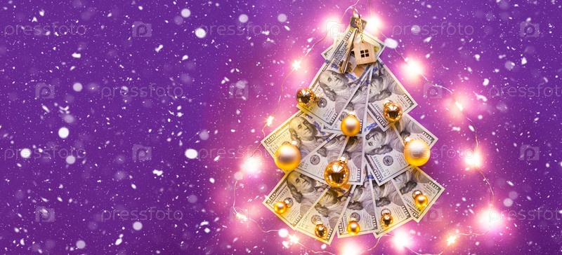Рождественская елка из 100-долларовых купюр на фиолетовом фоне с копирайтом и ключом от дома. Рождественский декор финансов, сбережений, богатства, расходов в новом году. Недвижимость, жилье, ипотека, переезд