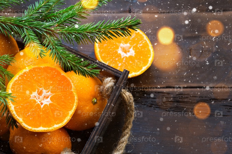 Свежие мандарины в коричневой коробке на деревянном фоне с зелеными еловыми ветками. Рамка, пространство для копирования, праздничный и зимний аромат, новый год, Рождество. Здоровое питание, апельсиновый сок, витрина. Нарезать и вырезать