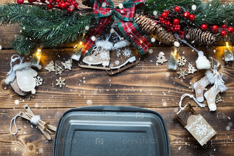 Рождественский декор, снег из контейнеров службы доставки еды. Предновогодняя акция. Готовый горячий заказ, одноразовая пластиковая и бумажная упаковка. Работа по организации питания в праздничные дни. Скопируйте пространство, макет