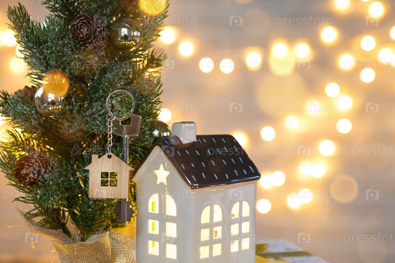 Ключ от дома с брелоком на столе с рождественским декором. Подарок на Новый год, Рождество. Строительство, дизайн, проект, переезд в новый дом, ипотека, аренда и покупка недвижимости. Копировать пространство
