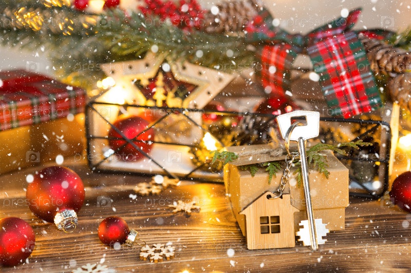 Ключ от дома с брелоком на столе с рождественским декором. Подарок на Новый год, Рождество. Строительство, дизайн, проект, переезд в новый дом, ипотека, аренда и покупка недвижимости. Копировать пространство