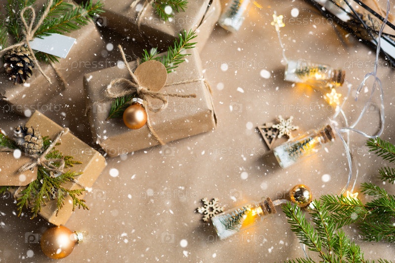 Упакуйте подарок к Рождеству и Новому году из экологически чистых материалов: крафт-бумага, живые еловые ветки, шишки, шпагат, снег. Теги с макетом, натуральный декор, ручная работа, сделай сам. Праздничное настроение. Плоско, фон