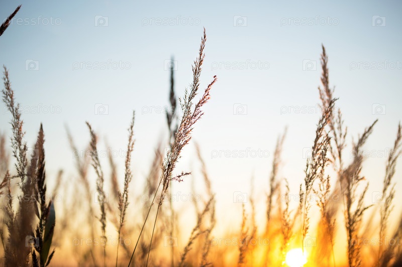 Метелки сухой травы пампасов на фоне оранжевого неба с заходящим солнцем. Природа, декоративные дикорастущие камыши, экология. Летний вечер, сухая осенняя трава