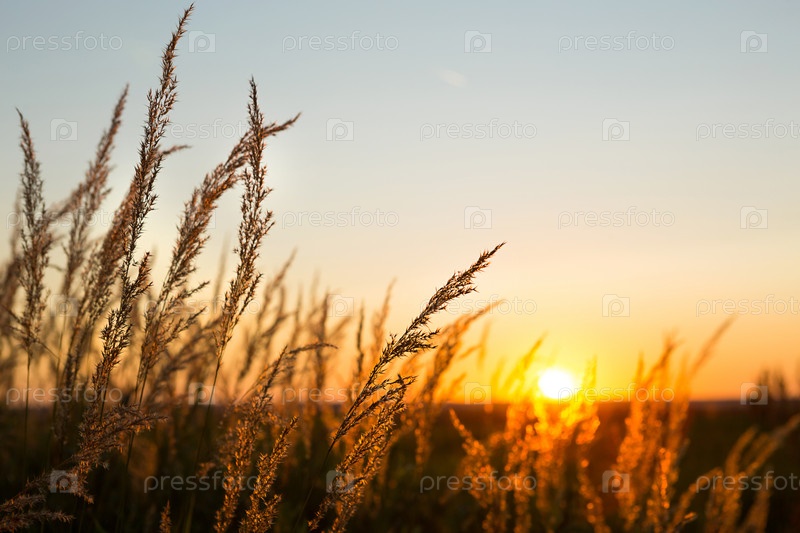 Метелки сухой травы пампасов на фоне оранжевого неба с заходящим солнцем. Природа, декоративные дикорастущие камыши, экология. Летний вечер, сухая осенняя трава