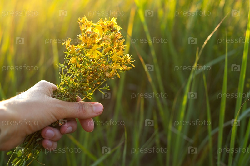 Букет зверобоя в руке на фоне травы в солнечном луче. Лекарственные травы, чайный сбор, нетрадиционная медицина. Летняя пора, сельская местность, экология, гармония с природой. Копировать пространство