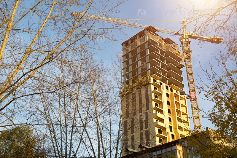 Строительство многоэтажного жилого дома в г. Кран возле небоскреба. Строительство, переезд в новую квартиру, ипотека, аренда и покупка недвижимости. Копировать пространство